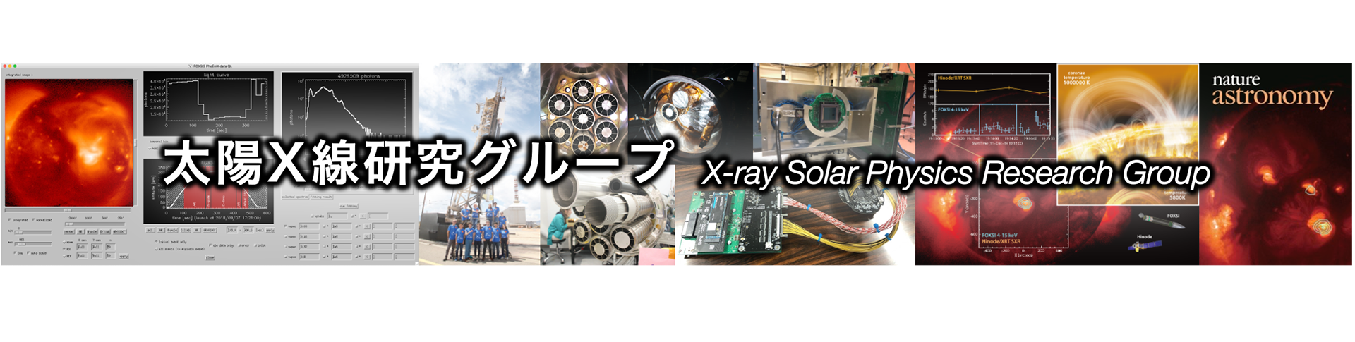 太陽 で起きている 高エネルギープラズマ現象 の理解のために、人工衛星 や 観測ロケット などの飛翔体に搭載された観測装置を用いて 太陽コロナ の X線観測 を行い、それで得られた 観測データの解析 を軸に研究を進めているグループです。また、次世代の 観測装置の開発 も行っています。